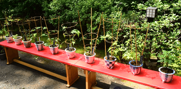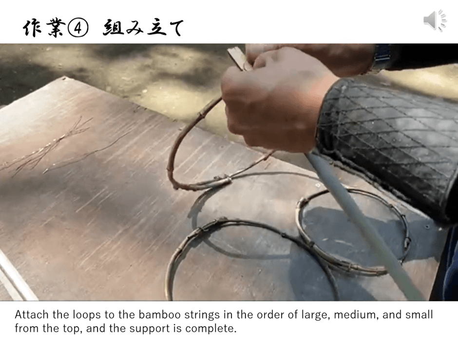 江戸時代の園芸種変化朝顔の特徴、名前等をご紹介しています。当園の庭師による行燈支柱作りの熟練の手つきにもご注目ください。