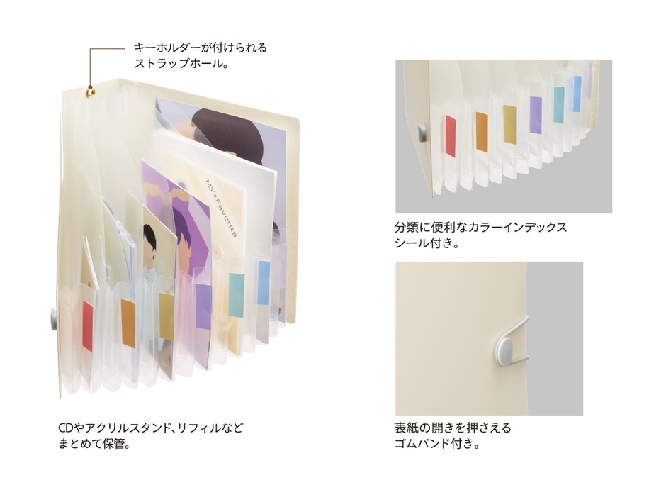 厚みのあるアクリルスタンド・缶バッジなどもたくさんとじられるように収容量がさらにUP。