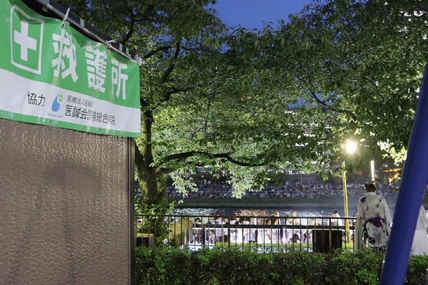 医療法人医誠会は、地域社会への貢献として天神祭の救護活動に積極的に参加しています。今回は医誠会国際総合病院から3名の医師がボランティアとして参加し、船渡御本部、源八橋下流右岸、桜ノ宮橋下流左岸の3か所の救護所で活動を行いました。救護所にはイベントナースや搬送スタッフも配置され、チームとして協力しながら対応しました。