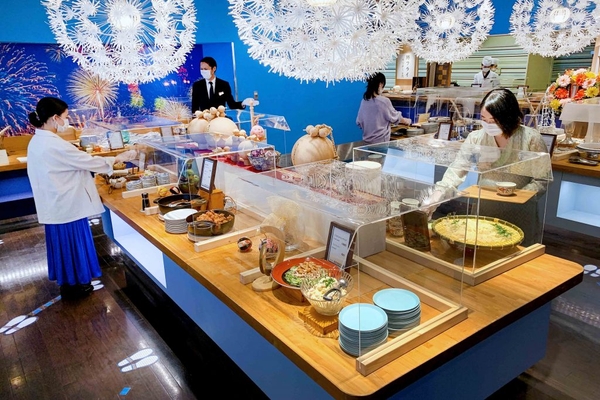2020年7月1日スタート。感染能力を無力化する抗ウイルスコーティングの塗布、全料理への飛沫感染対策カバー設置、マスクと手袋の用意、専任スタッフによる混雑回避など。