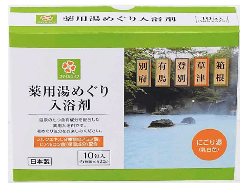「スマイルライフ 薬用湯めぐり入浴剤」は保湿効果のあるシルクエキス・8種類のアミノ酸・ヒアルロン酸を配合しています。1箱に5種類の香りを取りそろえ、自宅で温泉めぐりの気分を味わうことができます。