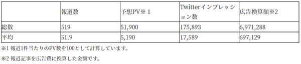 昨年11月22日~12月24日の期間内に、10社のPRサービスを実施しましたが、次表の通り、報道総数は519件となり、1社平均51.9の媒体で紹介されたことになります。これに伴う、予想PVは、総数51,900、一社当たり5,190となりました。また、Twitterインプレッション数は、総数175,893、一社当たり17,589となっています。そして、この報道の価値ですが、広告換算で総額6,971,288円、一社当たり697,129円となっています(NEWSCASTデータ)。