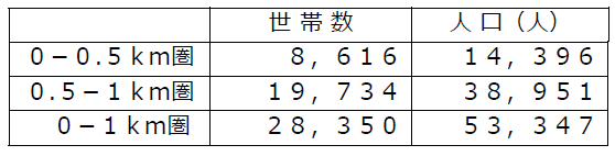 ・店舗から1km圏内は単身世帯比率が52.2%、2人世帯比率は23.0%と全体の7割強が少人数世帯です。