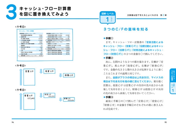 図解・レベル1→2→3というステップを踏むことによって、無理なくスムーズに決算書を読む技術が身につきます。