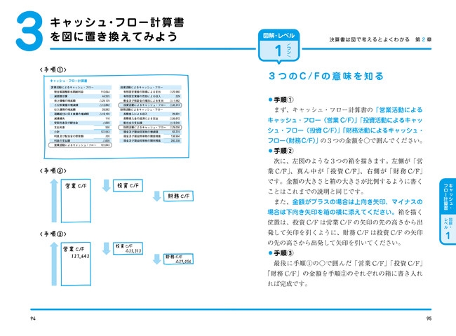 本書では、正しい順番で決算書の読み方を学ぶため、図解のレベル(難易度)を3段階に分け、段階的に理解を深める方法を取っています。
