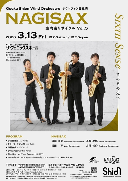 日本で最も長い歴史と伝統を誇る交響吹奏楽団の Osaka Shion Wind Orchestra を有する公益社団法人大阪市音楽団(本社:大阪市住之江区/理事長:石井徹哉)は、2026年3月13日に開催の「NAGISAX 室内楽リサイタル Vol.5」のプログラムを全曲発表いたしました。