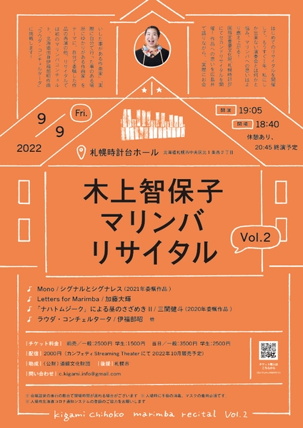 Chihoko&『木上智保子マリンバリサイタルvol.2』が2022年9月9日(金) に札幌時計台ホール(北海道札幌市中央区北1条西2丁目)にて開催されます。