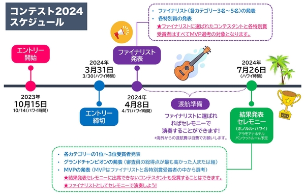 中間発表として、日本時間4月8日(ハワイ時間4月7日)、各カテゴリーから3~5名のファイナリスト、および各特別賞が発表されます。そして各カテゴリーの1位、2位、および3位を含めた最終結果は、ハワイ時間7月26日の最終結果発表セレモニーで発表されます。そして各カテゴリーの1位受賞者には、副賞としてカマカ、カニレア、コアロハなどの高品質のハワイアン『ウクレレ』が贈呈されます。ファイナリスト、各特別賞受賞者の中から、審査員が最も感銘を受けたコンテスタントには、MVPのトロフィーが贈られます。