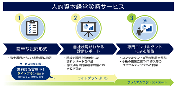 なお、本サービスのリリースを記念して、期間限定で人的資本経営診断サービスの「ライトプラン」相当を無料でご提供します。人的資本経営の課題解決と現状把握にご活用ください。