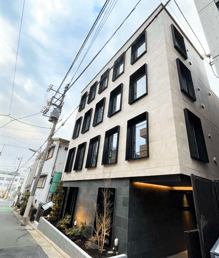 また、当該地は東急目黒線「不動前」駅から徒歩圏内にあり、学校に囲まれた住宅街に存在しています。静かな街並みに溶け込みながらも、規則的に並ぶ開口が、集合住宅特有の単調なファサードとは異なる印象を持たせ、素材感・色調に高級感のあるファサードに仕上げました。