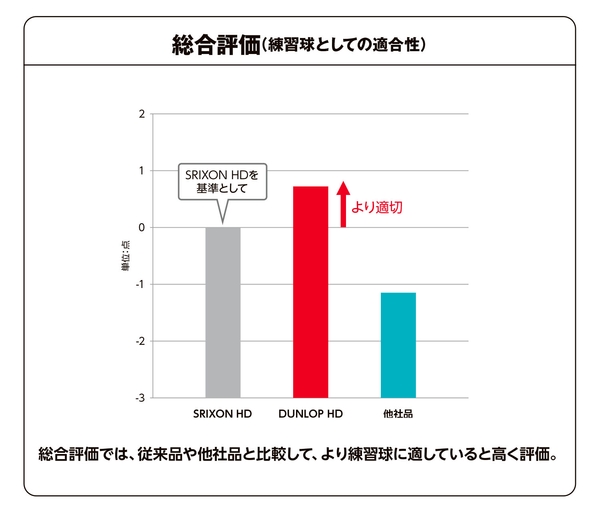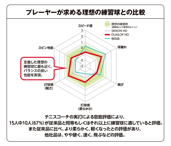 ※1「理想の練習球」とは、当社が定めた定義です。15名のテニスコーチにアンケートを実施し、「理想の練習球」に求められる6項目(スピード感、スピン性能、球離れ、飛び、打球感の柔らかさ、打球感の軽さ)の性能を設定。各項目偏りがなく、バランスが良いボールを「理想の練習球」と定義しました。