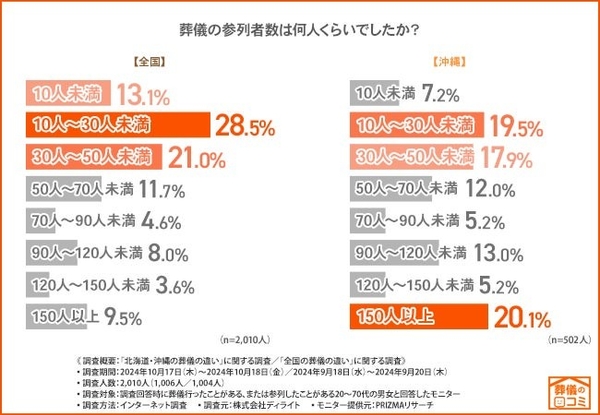 特に150人以上の参列者と回答した方が最多となり、数値としても全国の1割以下を大きく上回っています。