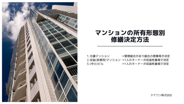 修繕には様々な形態がありますが、マンションの所有形態や修繕工事を誰が決定するのかで、想定される修繕やその決定方法が異なってくるのが実態に近いと思います。