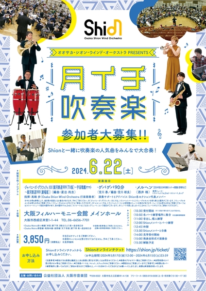 日本で最も長い歴史と伝統を誇る交響吹奏楽団のOsaka Shion Wind Orchestraを有する公益社団法人 大阪市音楽団(本社:大阪市住之江区/理事長:石井徹哉)は、月に一度、楽器を持っている方が集まって、Shionメンバーと一緒に吹奏楽曲を演奏できる人気イベント「月イチ吹奏楽」を2024年6月22日(土)に開催いたします。