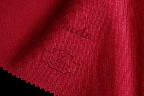 鮮烈なワインレッドカラーのRUDOロゴ入りのメガネ拭きも付属。