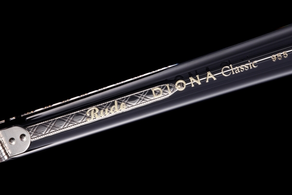 その「DIGNA Classic 955 Jimmy」をベースとしながら、品質の高い日本製のアセテート生地の中から「RUDO」限定となるスペシャルカラーのクリアグレーを選択、テンプル芯もRUDOコラボレーションモデル用に新たにデザインしました。ダブルネーム入りのアルミ製のケース、メガネ拭きも付属しています。