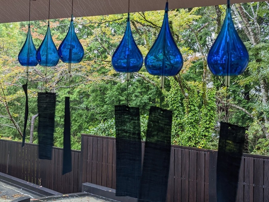各施設でご当地の素材や伝統工芸を用いたご当地風鈴を設えます。例えば、モダンなとちぎ民藝が息づく、木漏れ日の温泉旅館「界 鬼怒川」のご当地風鈴は、栃木県の伝統工芸「益子焼」と「黒羽藍染」を組み合わせたオリジナルの風鈴です。約100個のご当地風鈴がそよ風に吹かれると、陶器ならではの素朴な音がオーケストラのように響きあうことで、湯上がりにいっそうの涼を感じられます。