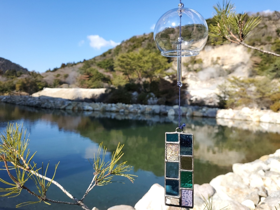 大分県竹田市のガラス工房で作成された、竹の鳴子と藍染の短冊を組み合わせた風鈴。