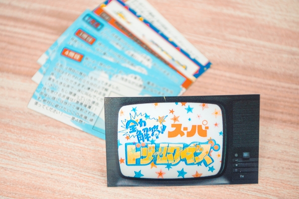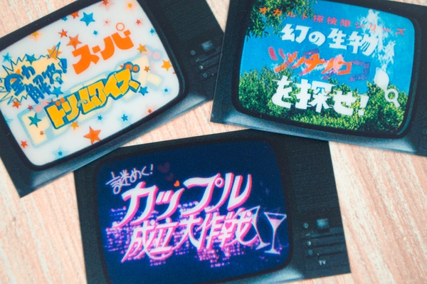 また、番組タイトルは角度により絵柄が変化する名刺サイズのシールとなっており、遊んだ後もスマホカバーや手帳に貼って思い出として残すことができます。さらに、3商品をセット購入すると手に入る収納ケースは、レトロなブラウン管デザイン。番組タイトルをセットすると、まるでテレビ画面に映し出されるかのように商品を飾ることができます。