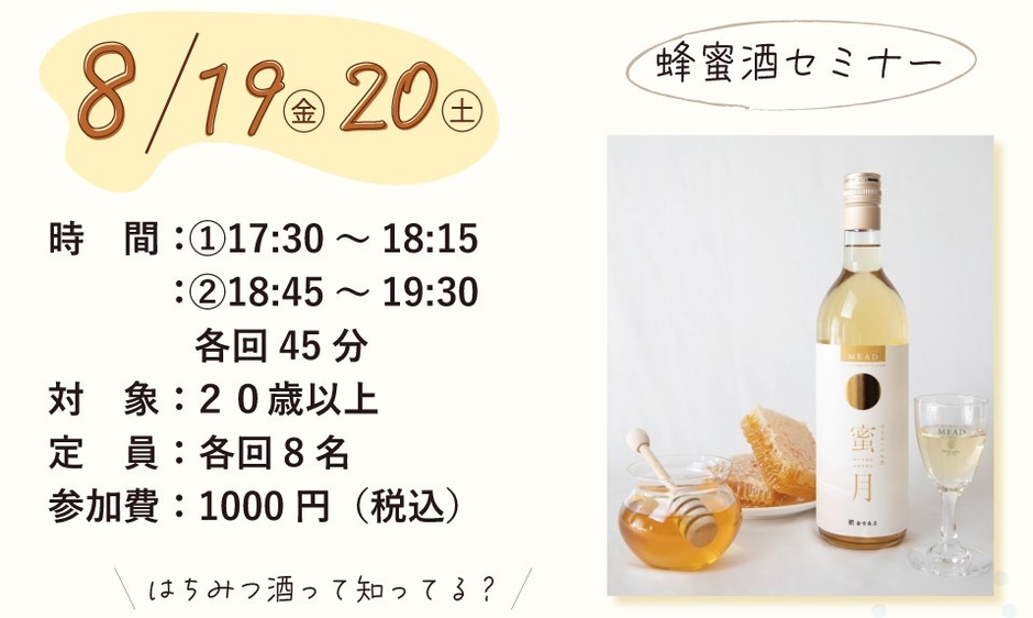 ①はちみつ酒セミナー「ミールミィでミードデビューしてみよう!」<予約受付中>