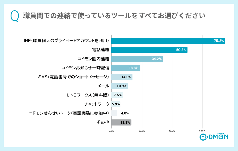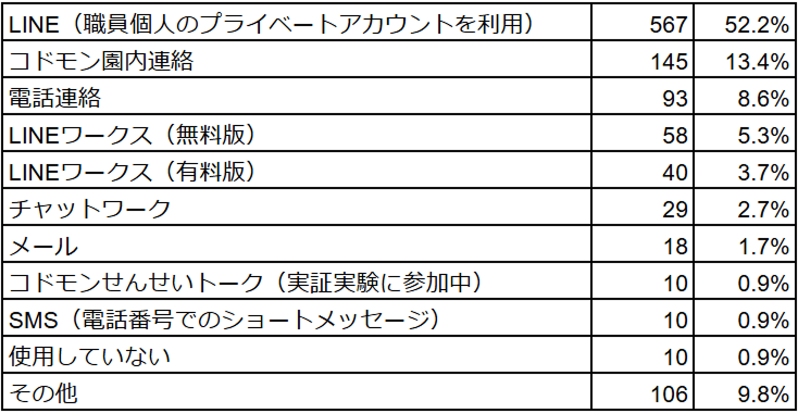 職員間の連絡ツールについて、7割以上の施設がLINE(職員個人のプライベートアカウントを利用)と回答。また半数以上の施設で電話連絡も行われていることがわかりました。