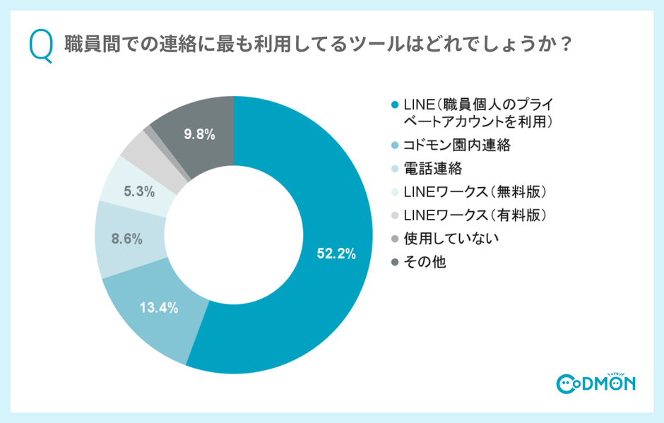 *職員間での連絡に最も利用されているツールは職員個人(プライベート)のLINEアカウント(52.2%)。