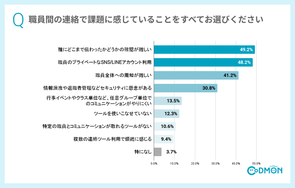 また、Q1、Q2では職員個人のアカウントでのLINE連絡が多かったですが、「職員のプライベートなアカウント利用」という点を課題に感じている施設も多いことがわかりました。課題があってもLINEを使い続ける背景には、施設内でのやり取りに適切なツールが少ないことや、ツールを導入しても使いこなせないことなどが考えられます。