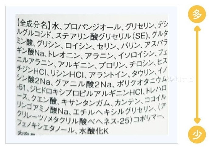 訴求成分(肌悩み向けのウリ成分)が前に来ることが多く、先に書かれている=多く配合されているとは限りません。