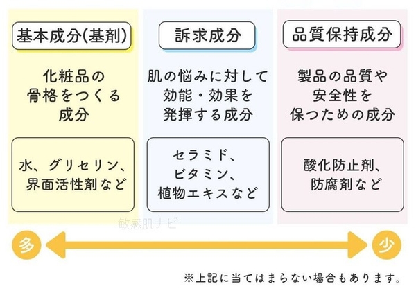 ・敏感肌では配合量「1%ライン」が重要。成分表示から分からない場合は目安リストを参考に。
