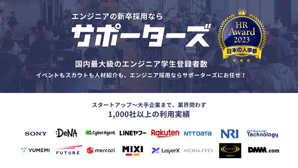 これまでに約1000社の新卒エンジニア採用支援、約7万人の学生エンジニアのキャリア支援を行ってまいりました。日本最大規模の登録数およびイベント数を誇り、年間約200イベントを実施しています。サポーターズが提供する就職支援事業およびキャリア支援事業は、累計1,000社を越える企業に利用いただいています。