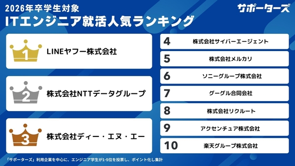 株式会社CARTA HOLDINGSのグループ会社で、国内最大級のエンジニア学生のデータベースを持つ株式会社サポーターズ(東京都港区、代表取締役:楓 博光)は、「2026年卒対象 ITエンジニア就活人気企業ランキング」調査結果(以下、本調査)を公開しました。