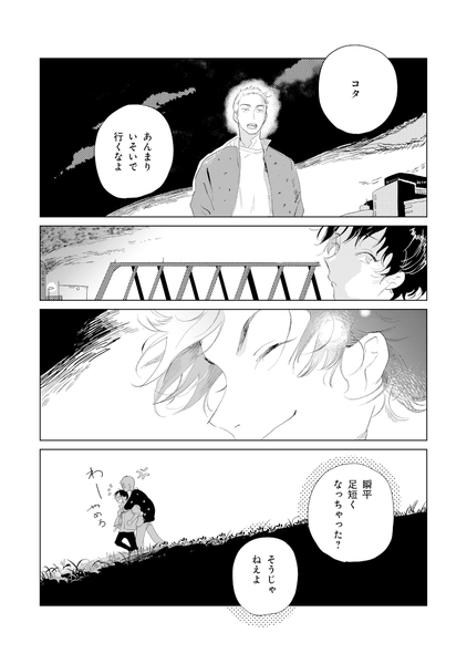 田舎とは違う生活にはしゃぐコタと、それに付き合いながら見守る瞬平。