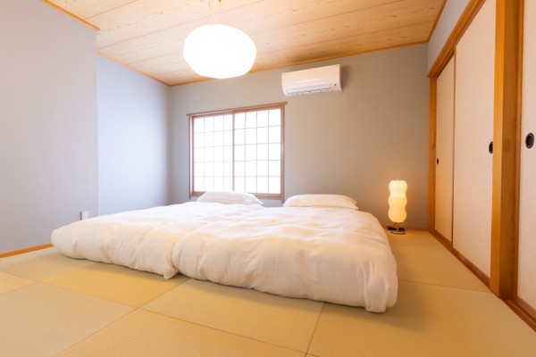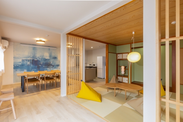 今回、開業した新スタイル旅館では、玄関ドアには宿泊者それぞれに自動で割り当てられた暗証番号キーを入力して入室するIoT技術を取り入れ、広々としたリビングに琉球畳を配した和室、温泉記号発祥の地である磯部温泉のロゴをあしらった卓球ルーム、BBQ が楽しめるウッドデッキなど、お客さまだけのプライベート空間を守れる“ウィズコロナ時代”に適した宿泊スタイルを実現している(旅館の詳細は公式HPを参照)。