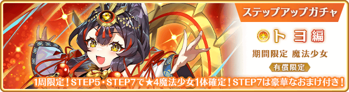 ・同時開催の『有償限定 ステップアップガチャ トヨ編』での★4魔法少女1体確定までのカウントは『期間限定 トヨ ピックアップガチャ』には引き継がれません。