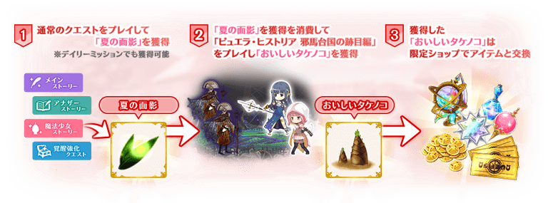 「夏の面影」を消費すると本イベントのクエストをプレイでき、限定アイテムや覚醒素材と交換できる「おいしいタケノコ」を獲得できます。