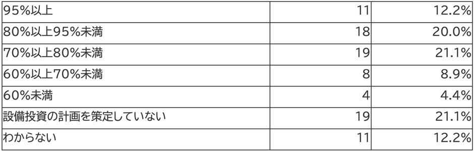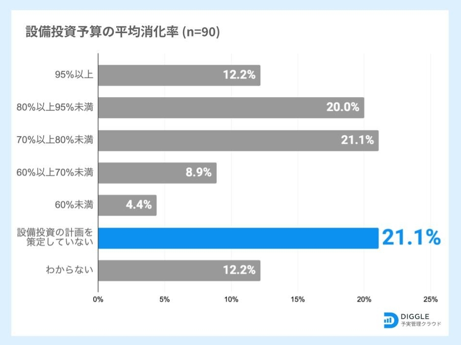 設備投資予算の使用状況を聞いたところ、そもそも「設備投資の計画を策定していない」企業が21.1%であった。また設備投資の計画を策定している企業(「設備投資の計画を策定していない」「わからない」以外の回答をした方)だけで見ると、平均消化率としてもっとも多かったのが「70%以上80%未満(31.7%)」、次いで「80%以上95%未満(30%)」であった。
