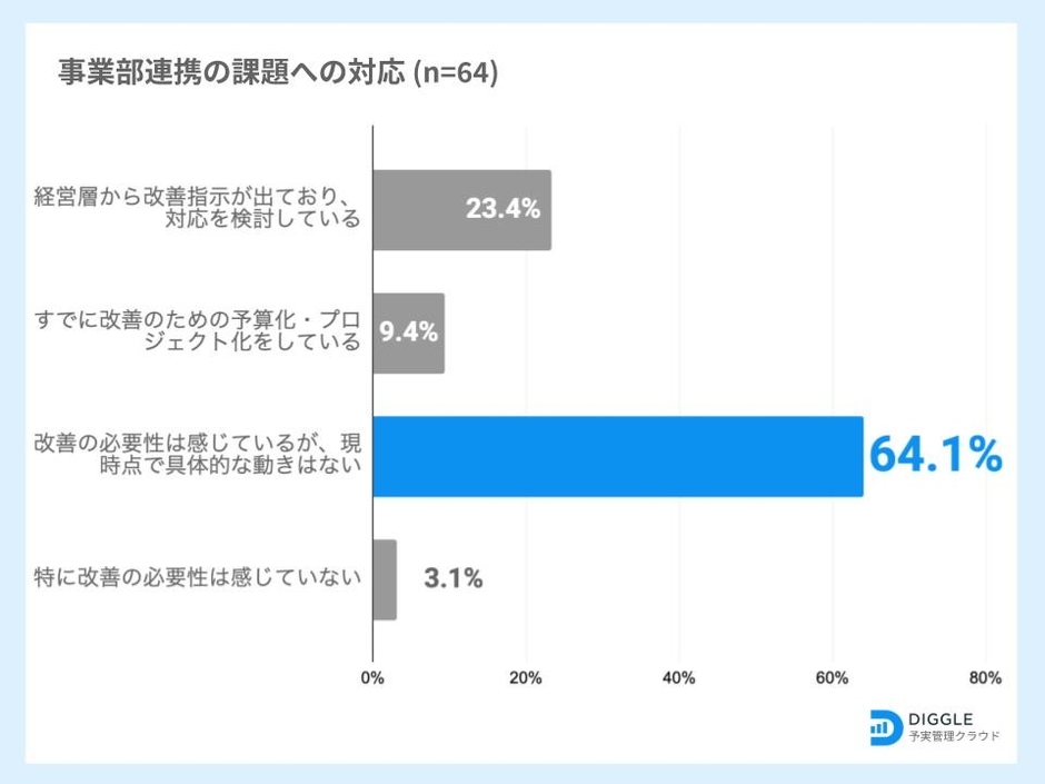 事業部連携の課題への対応としてもっとも多かったのは「改善の必要性は感じているが、現時点で具体的な動きはない(64.1%)」