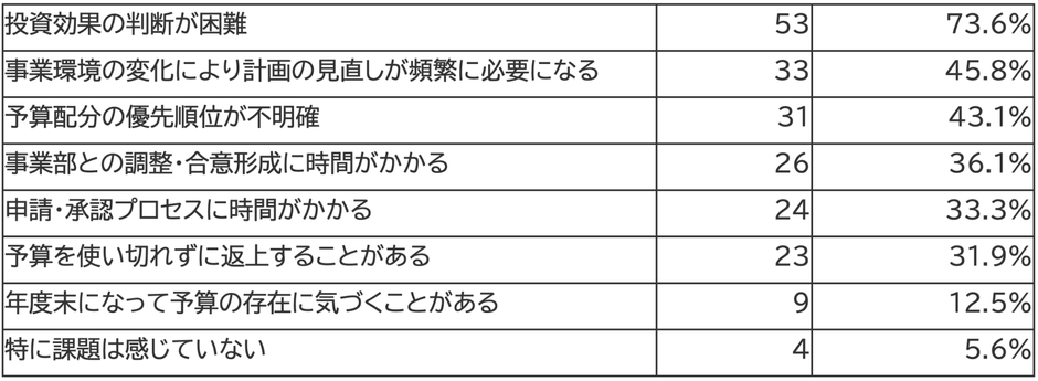 設備投資の予算配分・消化でもっとも多い課題は「投資効果の判断が困難(73.6%)」