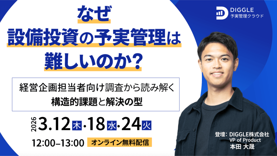 国内の設備投資機運が高まっている背景・マクロ環境やトレンドから、今回の調査結果を踏まえ見えた企業の設備投資管理の課題と解決策を解説するセミナーを、企業の設備投資管理の担当者などを対象に開催します。講師は1月20日にローンチした「DIGGLE設備投資管理」の事業責任者でDIGGLE株式会社VP of Productの本田が務め、「DIGGLE設備投資管理」のプロダクト概要のご紹介もいたします。