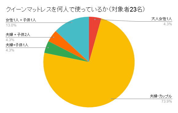 「クイーンサイズのマットレスを何人で使っているか」を調査したところ、大人女性1人が4.3%、夫婦・カップルが73.9%、夫婦+子供1人が4.3%、夫婦+子供2人が4.3%、女性1人+子供2人が13%%の結果となりました。
