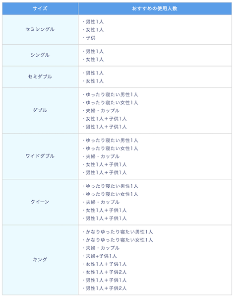 マットレスサイズについてのアンケート調査結果を踏まえ、おすすめの使用人数をまとめると、次のようになります。