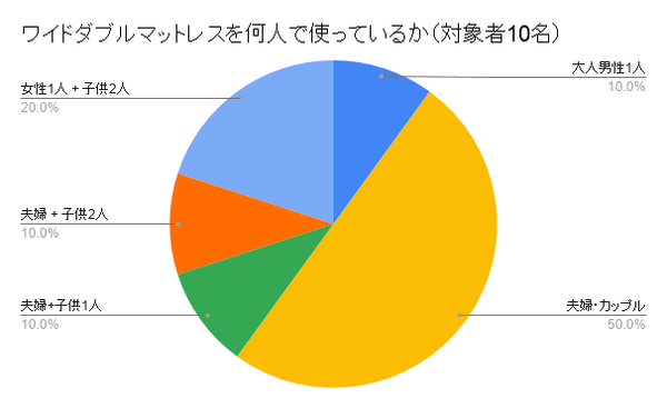 「ワイドダブルサイズのマットレスを何人で使っているか」を調査したところ、大人男性1人が10%、夫婦・カップルが50%、夫婦+子供1人が10%、夫婦+子供2人が10%、女性1人+子供2人が20%の結果となりました。