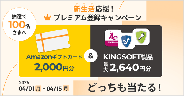 抽選で100名様にAmazonギフトカードと、対象のキングソフト製品で使えるクーポンをプレゼント