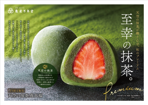 株式会社亀屋万年堂(本社・工場:神奈川県横浜市都筑区)は、「旬のおいしさを贅沢に味わう」をコンセプトに旬のフルーツを使用した「贅沢フルーツ大福」を各月、期間限定で販売しております。4月は丹精込めて作られた一番茶のみを厳選した「天空の抹茶」を餡と餅に贅沢に使用し、静岡県産「紅ほっぺ」を包んだ『天空の抹茶®苺大福』(1個270円(税込)・期間限定)が直販店舗(東京・神奈川28店舗)で好評販売中です。