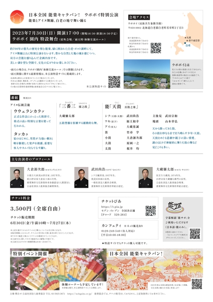 公益社団法人能楽協会主催、『日本全国 能楽キャラバン! ウポポイ特別公演』が2023年7月30日 (日)にウポポイ(民族共生象徴空間)園内 特設舞台(北海道白老郡白老町若草町2丁目3)にて上演されます。