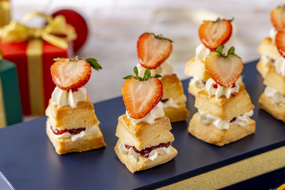 約15種類のセイボリーには、黒胡椒のピリッと感がアクセントの「スパニッシュオムレツのオープンサンド 黒胡椒マヨネーズ添え」、スモークサーモンのコク深い味わいがクセになる「スモークサーモンのバタームース」、こんがりとした焼き色が食欲をそそる「グラチネしたジェノベーゼクリームパスタ」など、祝祭感あふれる彩り豊かなメニューが並びます。その他、お子様にも楽しんでいただけるような「トマトコンソメスープ」や「ローズマリーポテト」、「ローストチキン フランボワーズ香るグランヴヌールソース」や「オレンジ香る白身魚のハーブロースト サウザンクリームソース」をご用意しました。