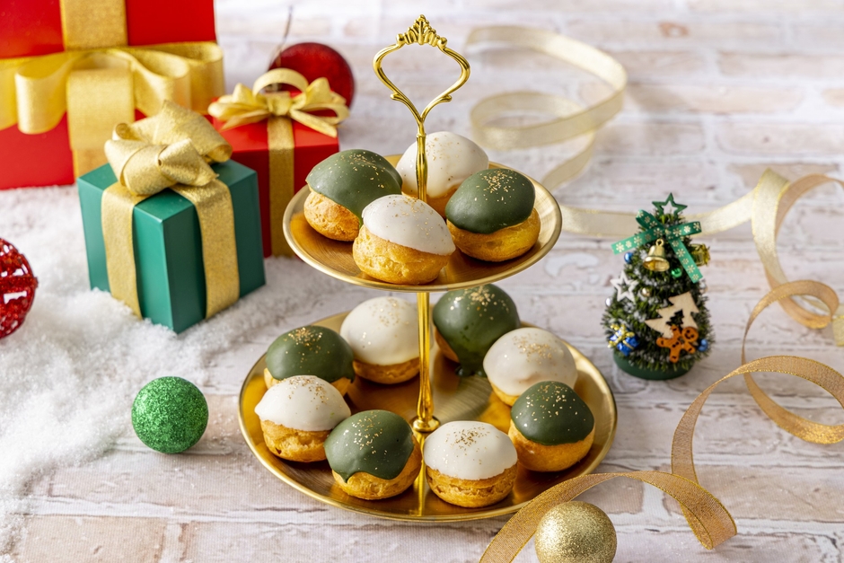 雪のような白色はカスタード、モミの木のような緑色は抹茶カスタードを入れて2つの味わいが楽しめるシュークリームに。振りかけた金紛でキラキラ輝く優美なデザインに仕上げました。