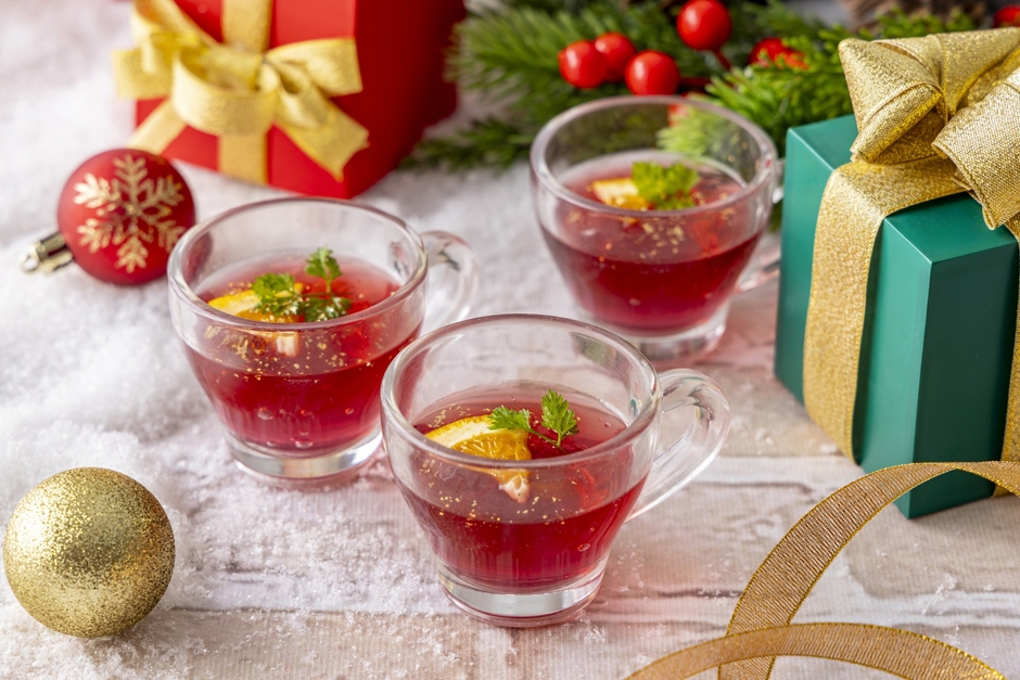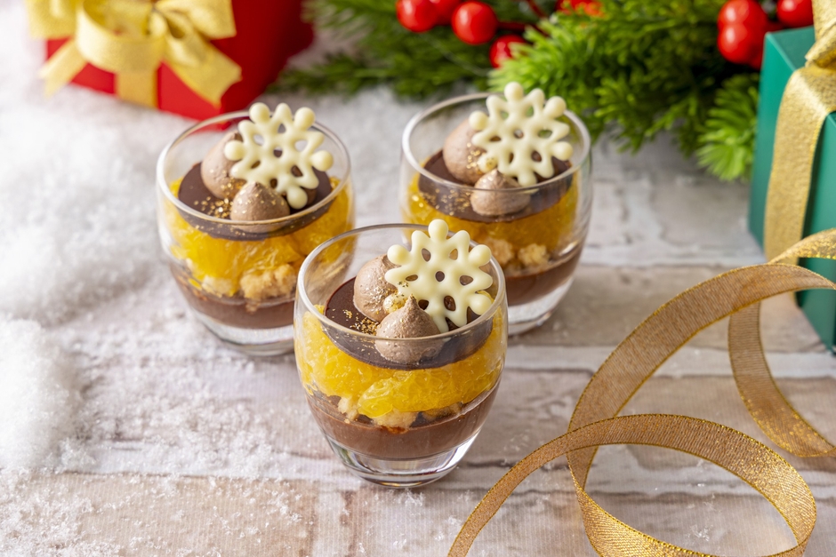 クリスマスに馴染みのあるグリューワインでおもてなし。ぶどうゼリーにグリューワインティーゼリーを重ねた2層仕立てのグラスデザートです。シロップ漬けのオレンジを飾り、見た目と味の爽やかさをプラスしました。