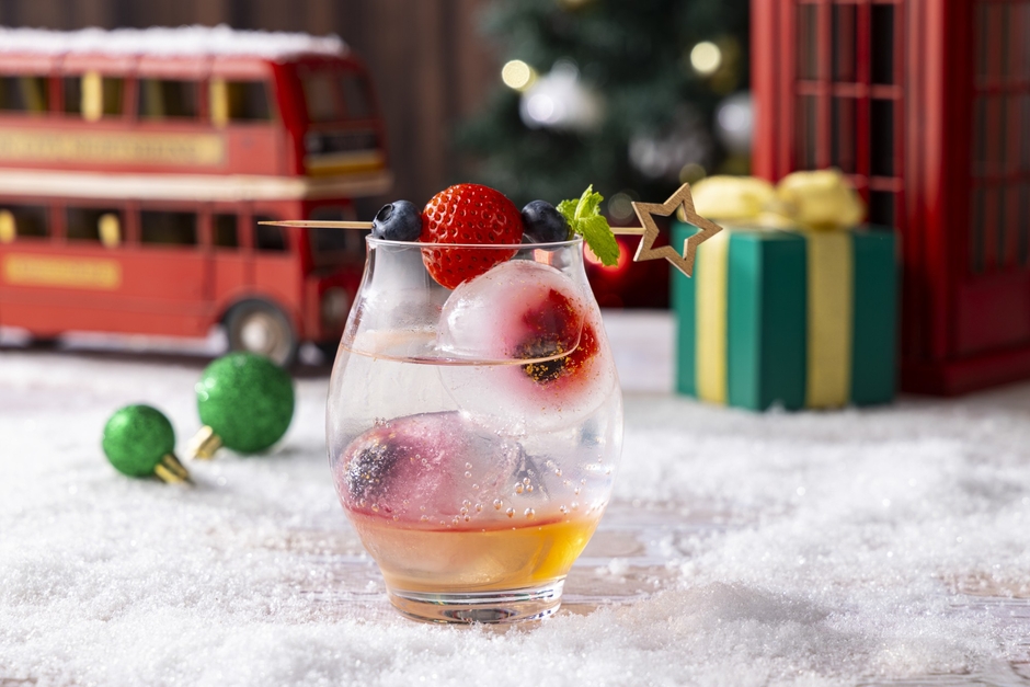 オーナメントモチーフの丸い氷を入れたグラスに、白桃シロップ、ソーダを注いだ、ほんのり甘いスパークリングドリンクです。苺とブルーベリーを閉じ込めた氷に金紛をまとわせ、キラキラと輝くオーナメントのような美しさを演出。星型のピックにあしらった苺とブルーベリー、ミントをグラスの縁に飾り、色彩のコントラストと香りのアクセントで、ひときわ華やかな一杯に仕上げました。グラス全体を使って、スノードームに映る、クリスマスの雰囲気に包まれたロンドンの街並みを表現しました。