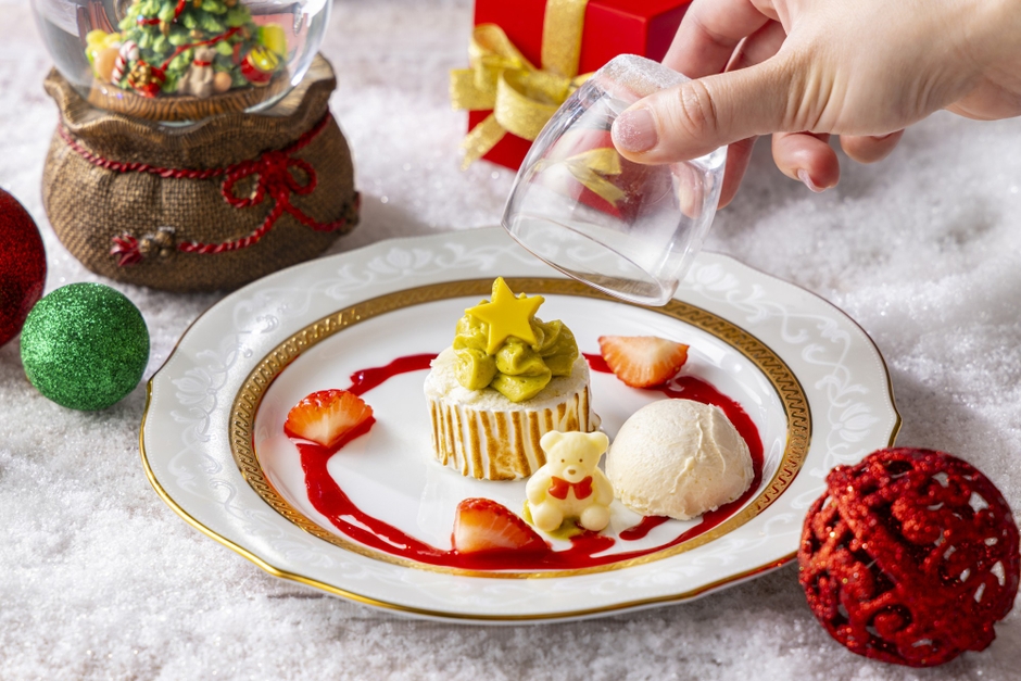 スノードームに見立てたライブステーションのスイーツは、グラスの蓋を開けるとピスタチオクリームのロールケーキが。ロールケーキはバーナーで炙り、切り株を模したデザインに。上にはクリスマスツリーのようなピスタチオクリームと星型のチョコレートを飾り、写真映えもする一品に仕上げました。横に添えたバニラアイスやフレッシュの苺ととともにコクのある「スノードームのピスタチオロールケーキ」をご堪能ください。